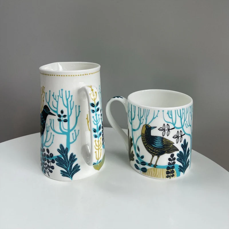Dainty bone china 1 pint jug featuring a chorus of birds in the woods with a beautiful patterned handle. A jug can also be a vase! Pop a posy of flowers in it or use it for milk at the breakfast table. A perfect gift for a bird lover. Also comes in orange.