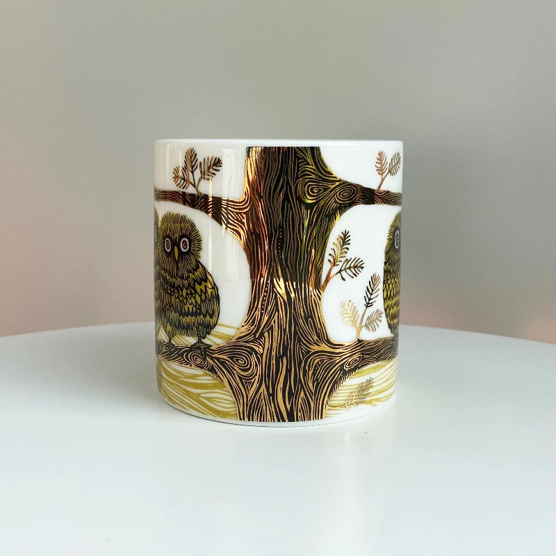 Four sweet owls on a bone china mug. In mustard and black on white with abundant gold lustre detail. You'll be powerless to resist.