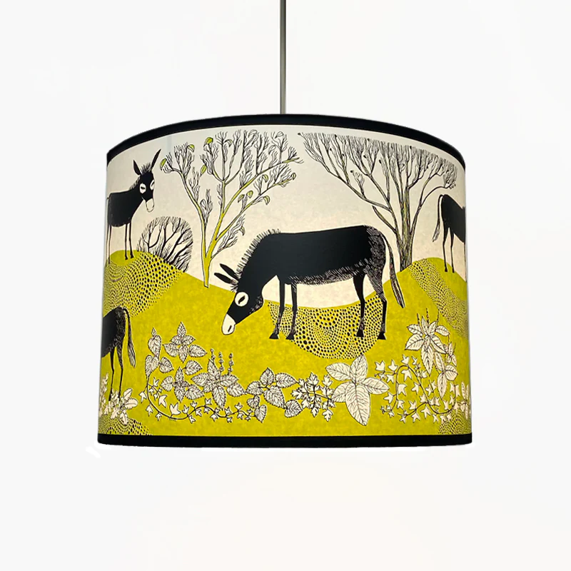 A delightful lampshade featuring darling donkeys in a pretty landscape with native wild flowers. Inspired by the retired donkeys that once gave rides to children on Blackheath and now enjoy retirement in Eltham in South East London.