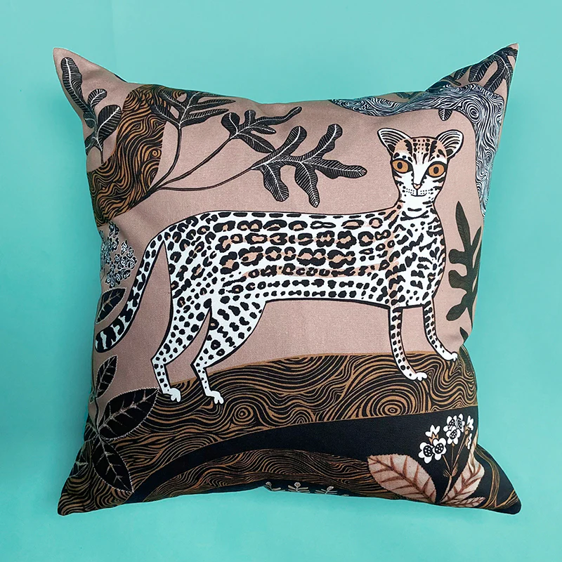 In the forests of South America, the beautiful Ocelot finds its home. This patterned-pelted pussy poses in seated and standing position on the two sides of this cushion, in shades of cocoa pink, brown and white.