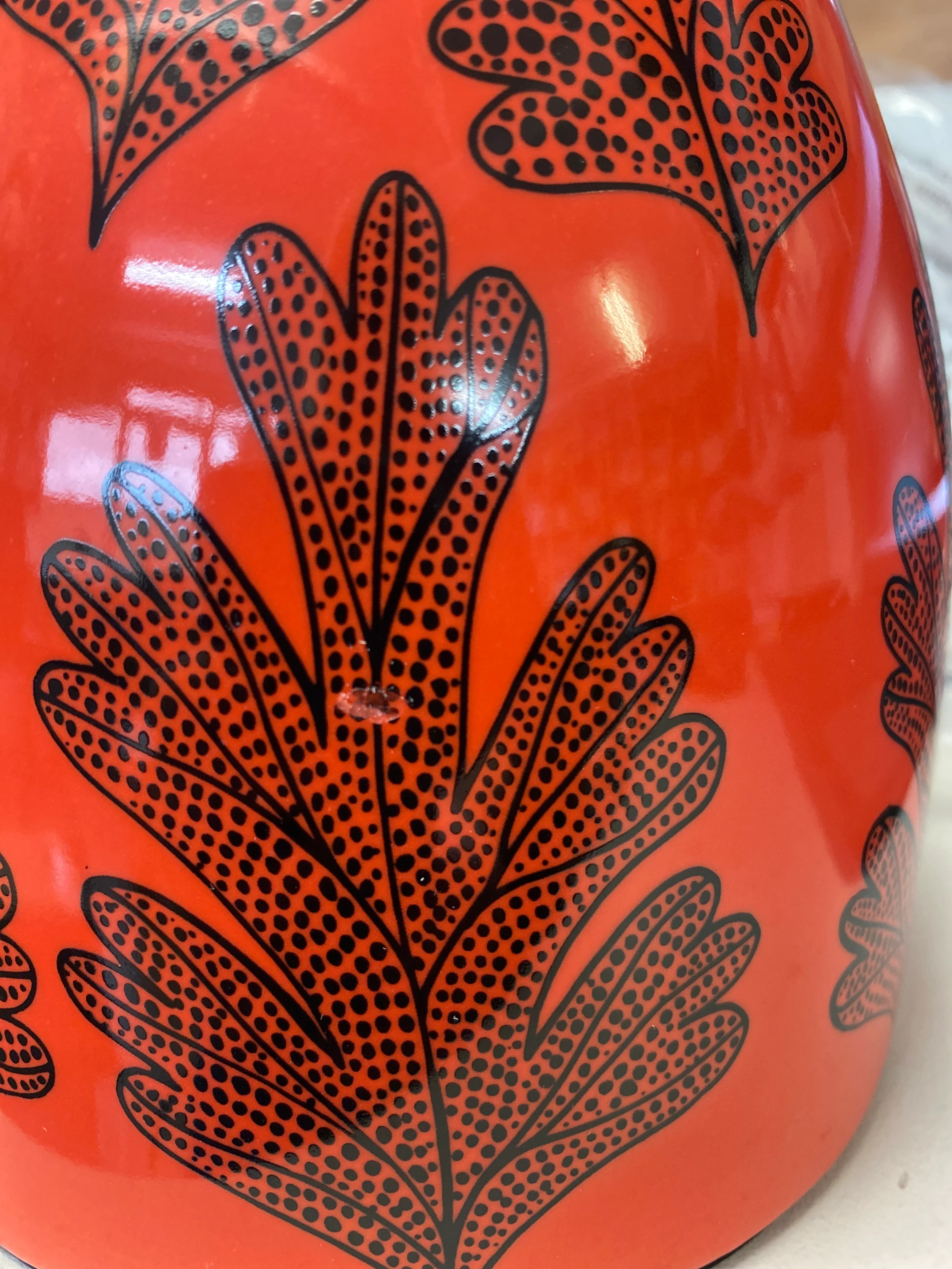 These lamp bases are made from ceramic decorated with beautifully drawn plants and this one has our vibrant orange-red glaze colour. Its a second because of small faults in the glaze (see detail pic)