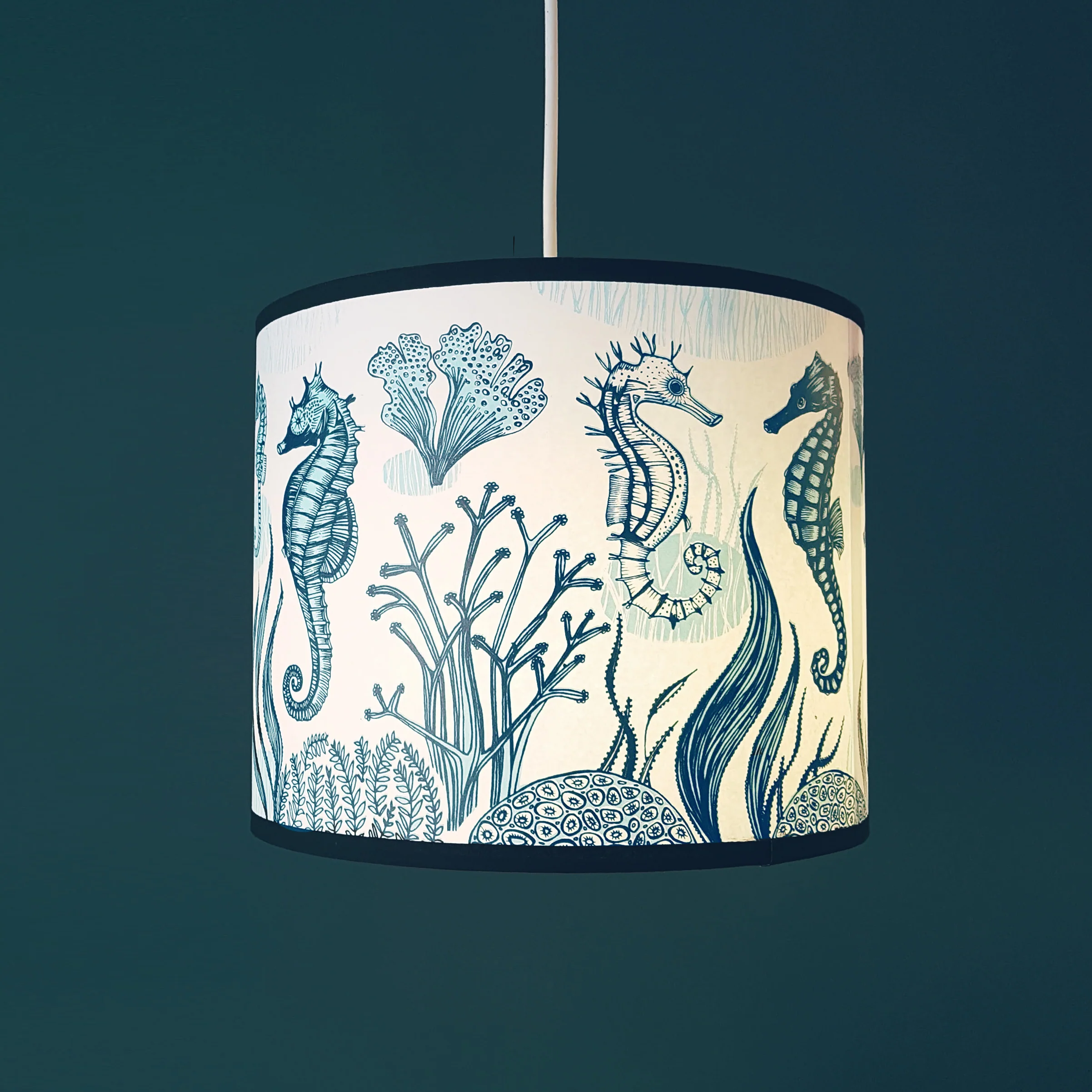 Seahorses are the most charming of creatures. The upturned snout, the curly tail, the proud belly. The ones on this lampshade can be found in the coastal waters of the uk. Here they are, enjoying each other's company in their underwater garden.